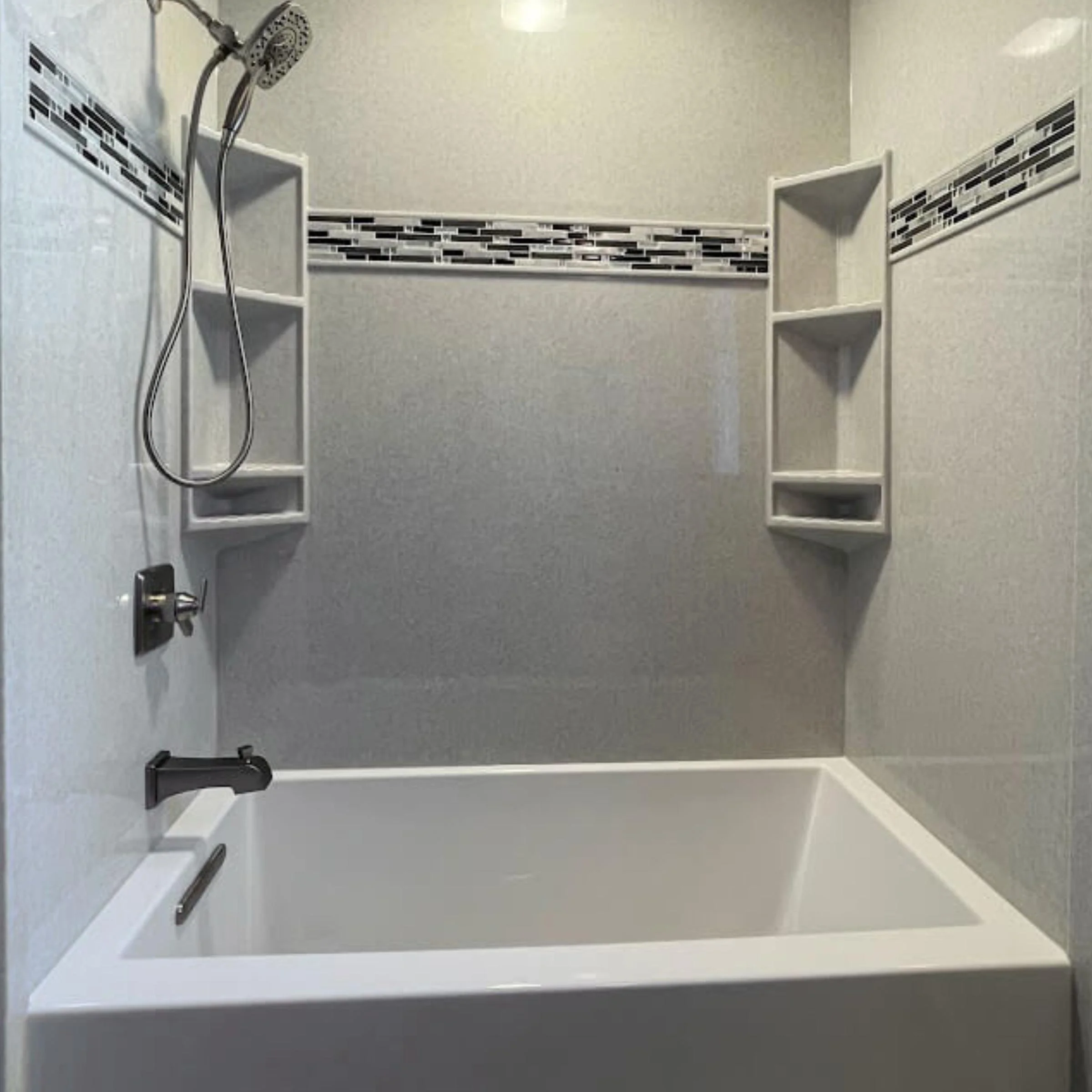 The area around your tub is the focal point of your bathroom space. We can show you what finishes we offer to make the best selection for your personal vision. Our tub surround systems come in finished panels and can be quickly installed. The panels are available in gloss, stone tile, subway tile, wavy tile, and shiplap finishes and come in any height and color.
